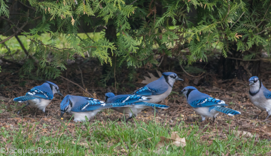 Un groupe de 16 Geai bleu (Blue Jay) arrive soudainement dans la cours ce matin pour se nourrir puis disparaissent aussiôt. Les deux photos en montre 10 des 16.